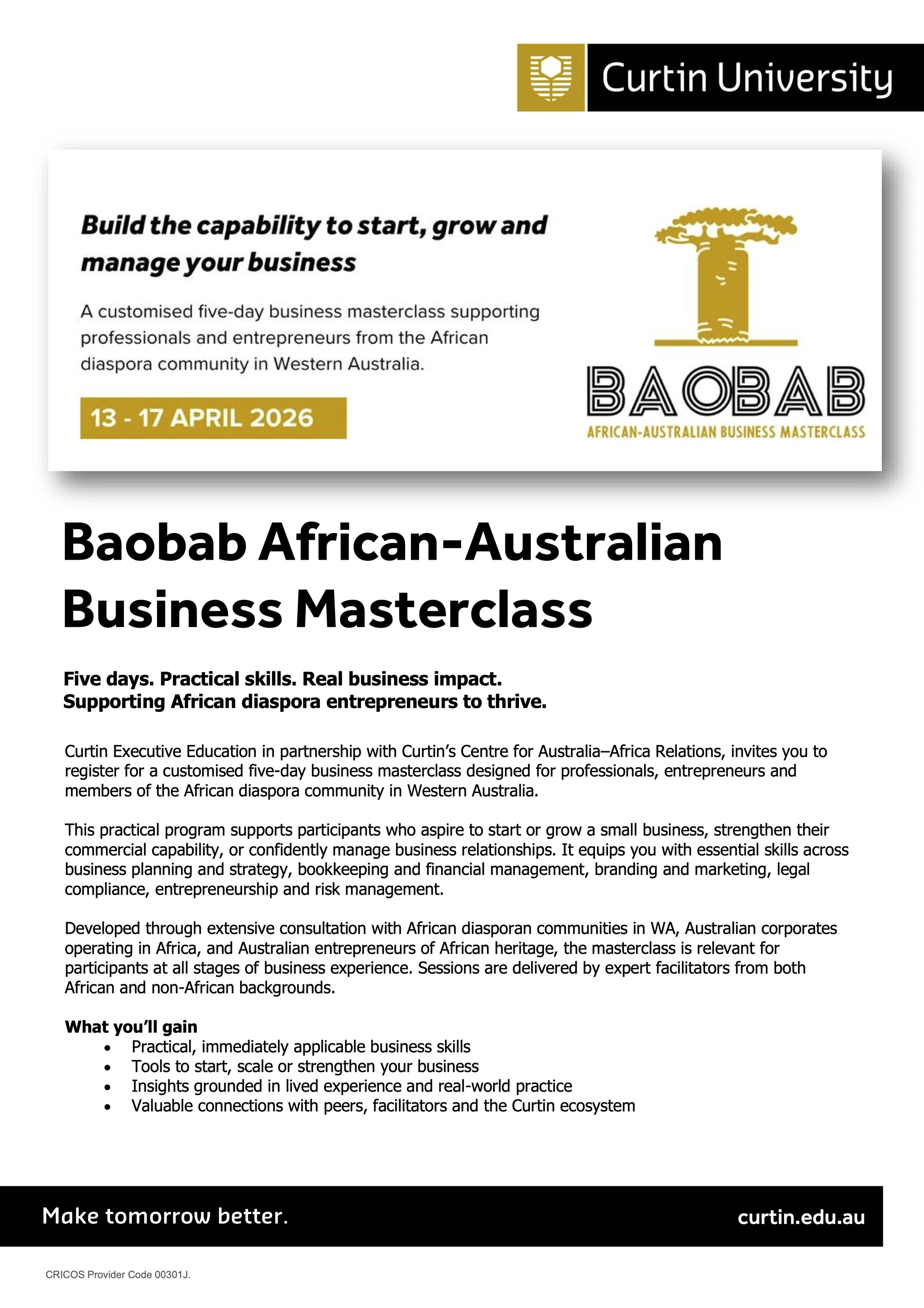 From 13–17 April 2026, Curtin Executive Education, in partnership with Curtin’s Centre for Australia–Africa Relations, will deliver the Baobab African–Australian Business Masterclass in Western Australia.