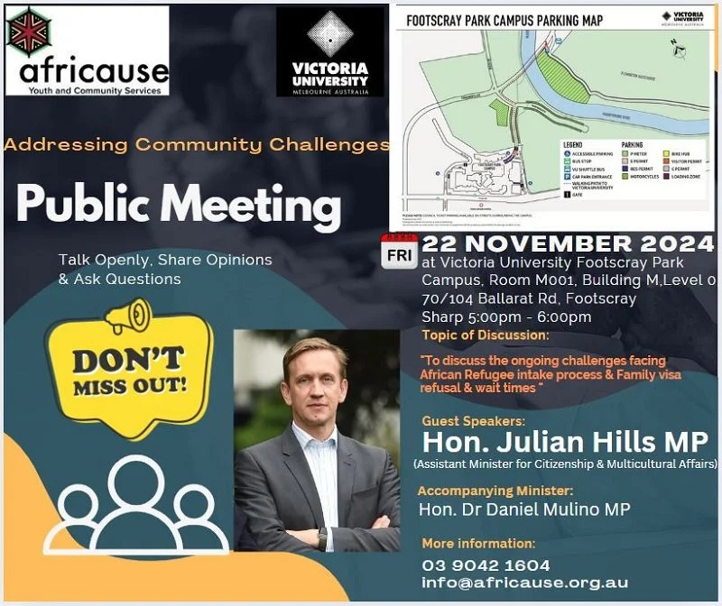 On Friday 22 November 2024, Africause, in collaboration with Victoria University, hosted a vital community forum addressing Australia’s visa system and settlement services. This event brought together participants from Melbourne’s African communities to discuss key challenges and propose meaningful solutions. The Malak Foundation extends its gratitude to Dr. Berhan Ahmed and the dedicated team at Africause for organizing this impactful event.