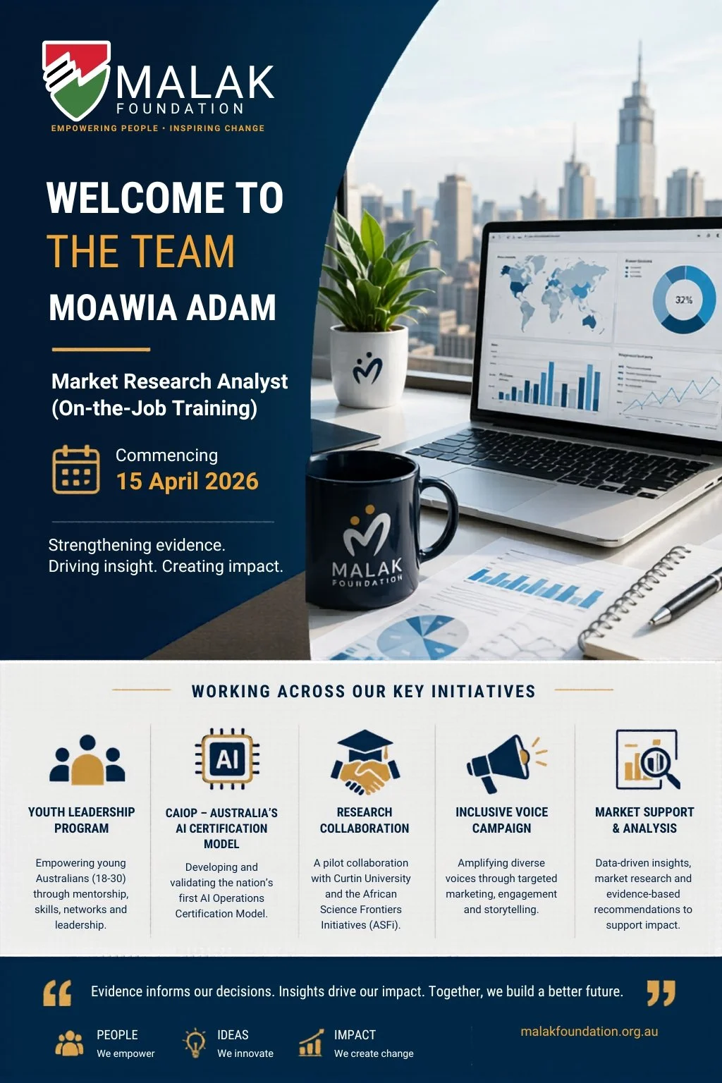 It is in this context that we are pleased to welcome Moawia Adam to the Malak Foundation team as a Market Research Analyst (on-the-job training), commencing 15 April 2026.